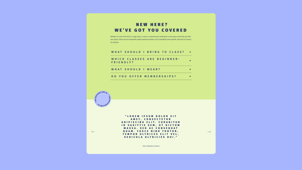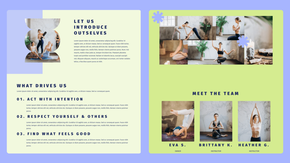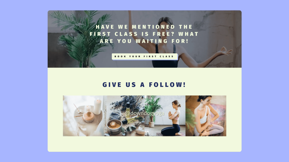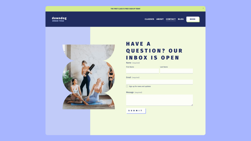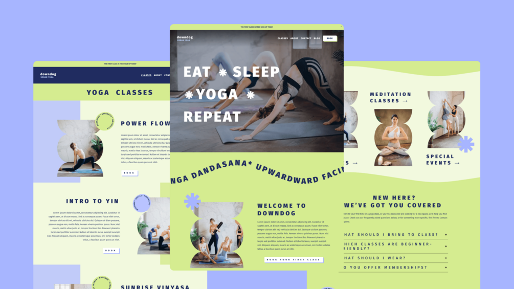 Down Dog is a modern, playful Squarespace template for yoga and fitness studios with a fun and friendly brand. It includes all essential pages to display class or event info and easily tie in to Squarespace's online scheduling tools.