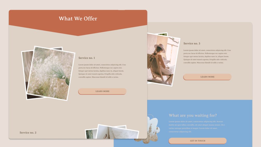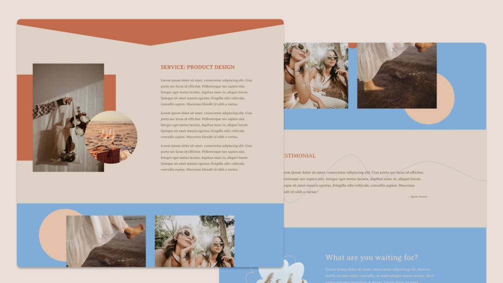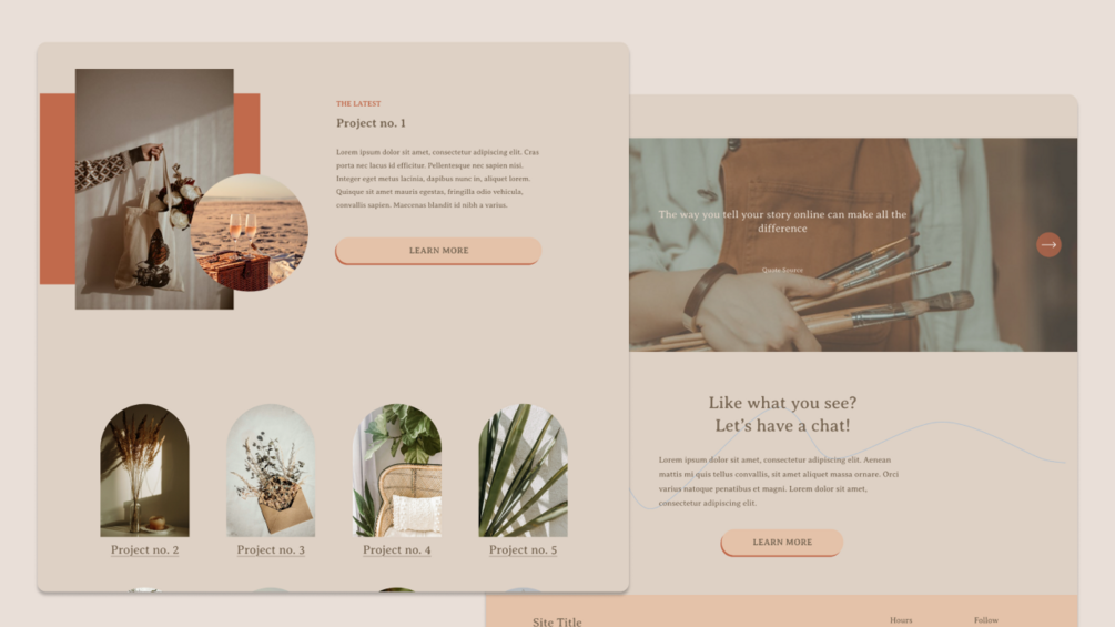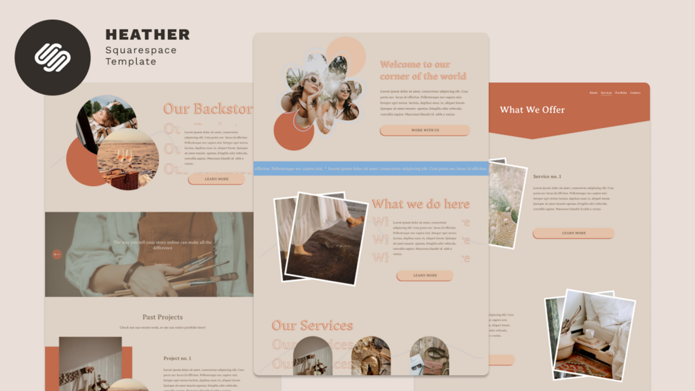 The Heather Squarespace Template features a modern boho indie aesthetic perfect for creatives, coaches, and other small businesses with a warm, friendly brand. It contains pages and page sections to display portfolio projects, services, testimonials, and more.
