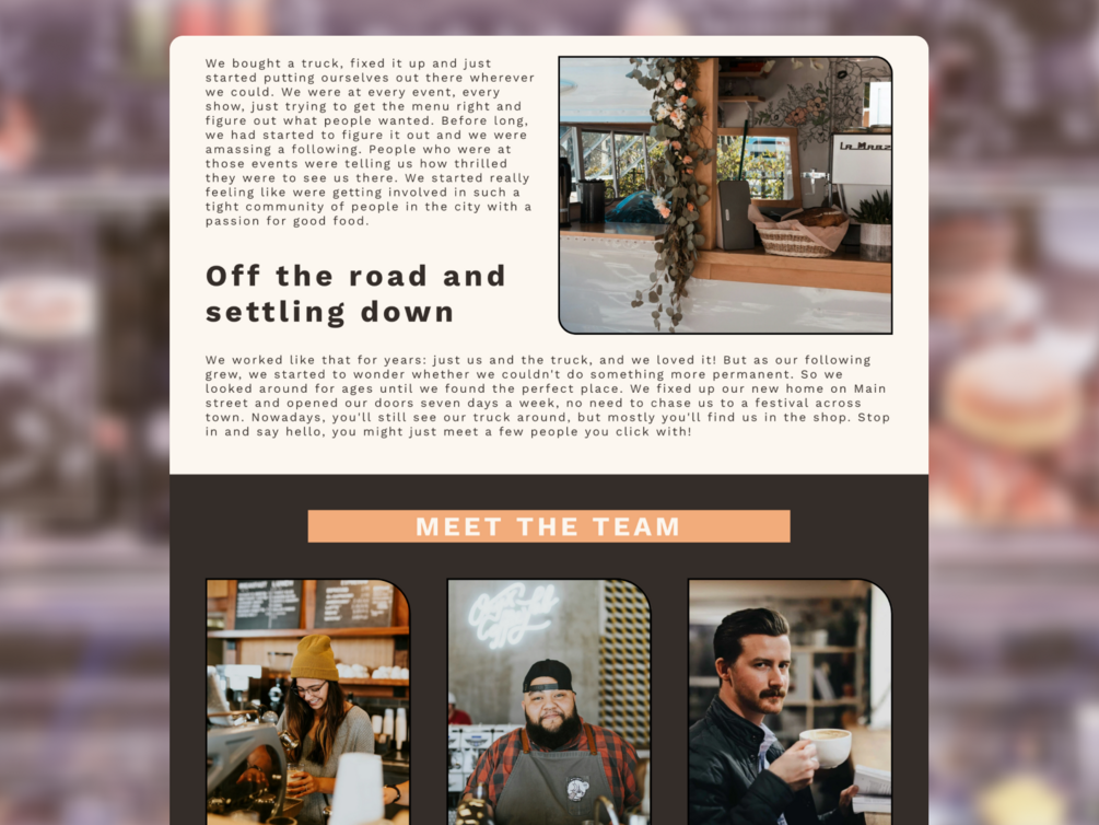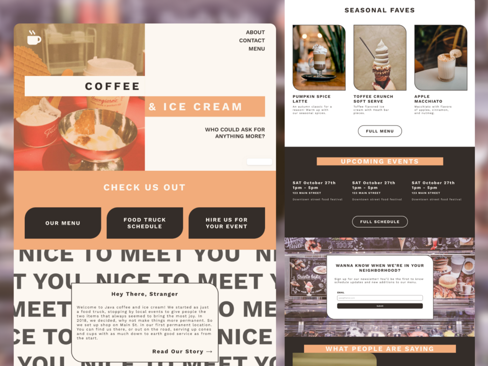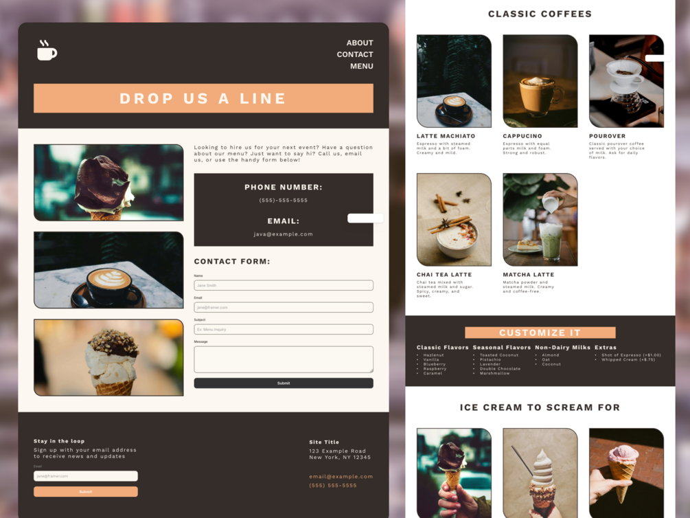 The Java Framer Template combines modern design with playful retro twists, perfect for coffee shops, food trucks and cafés looking for a website that is both fun and professional. It contains pages and page sections to display menu items, staff info, perfect for whether you have a food truck on location or special events in a brick and mortar store.
