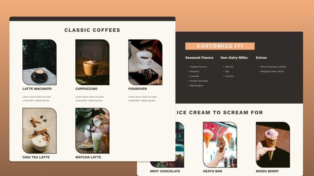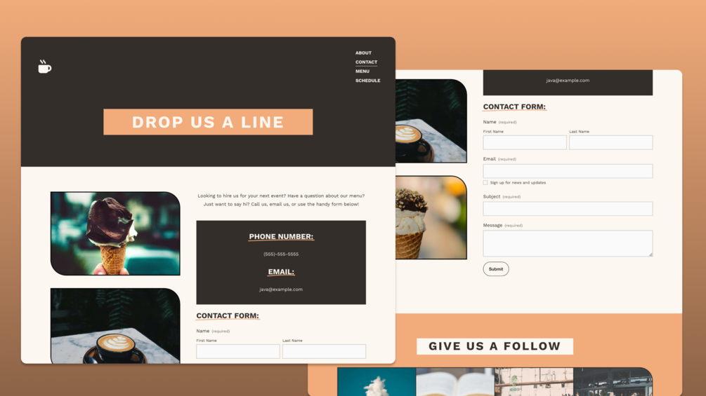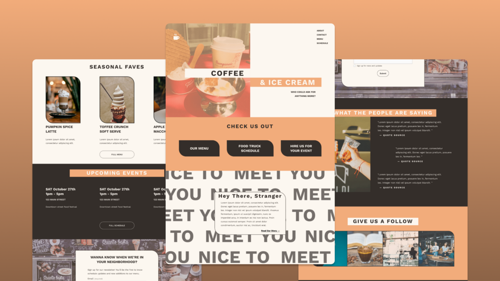 The Java Squarespace Template combines modern design with playful retro twists, perfect for coffee shops, food trucks and cafés looking for a website that is both fun and professional. It contains pages and page sections to display menu items, staff info, and event schedules whether you have a food truck on location or special events in a brick and mortar store.